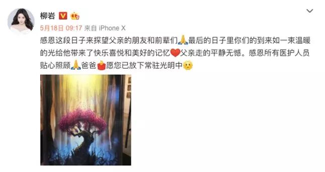 柳岩在微博中写道,父亲走的时候“平静无憾”,在他生命的最后一程,儿女都在身边,有最好的医疗团队,也许,他走得并不痛苦。