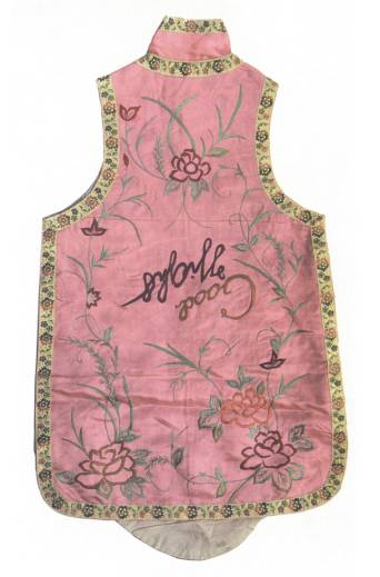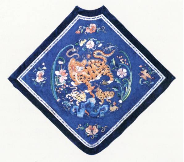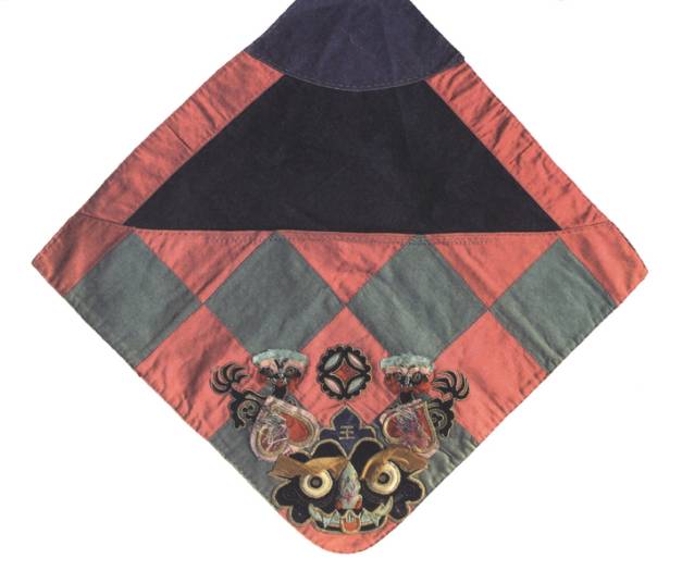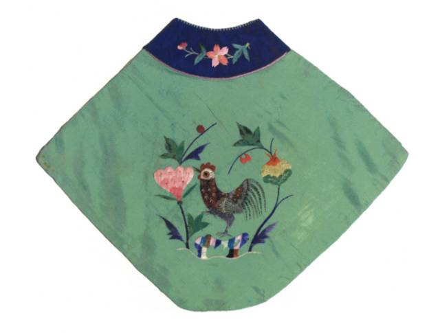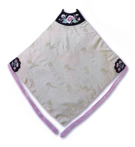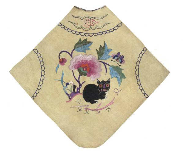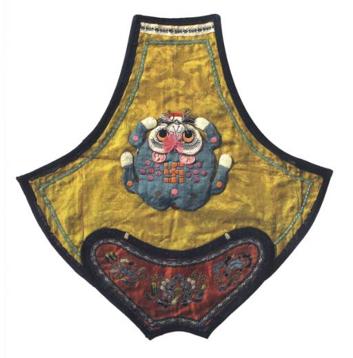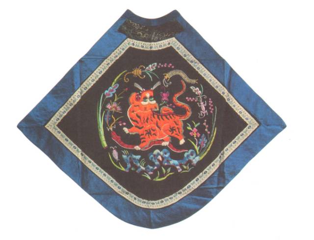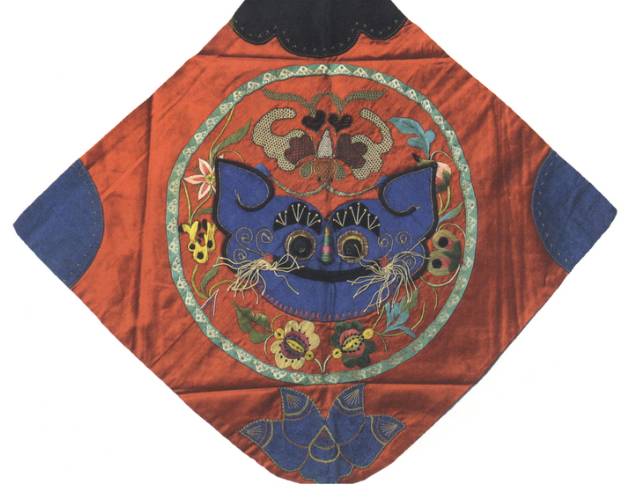 此肚兜菱形,上为半圆领,下端为圆角,中间黑地绣五彩艾虎五毒纹,此花纹常为民间作为避邪驱恶的象征。