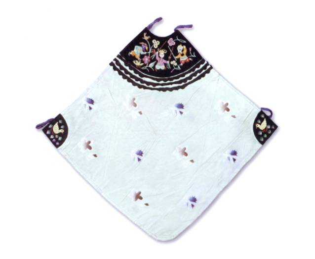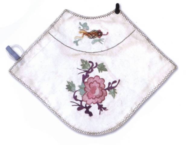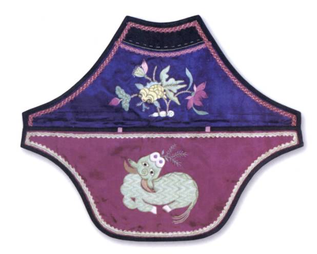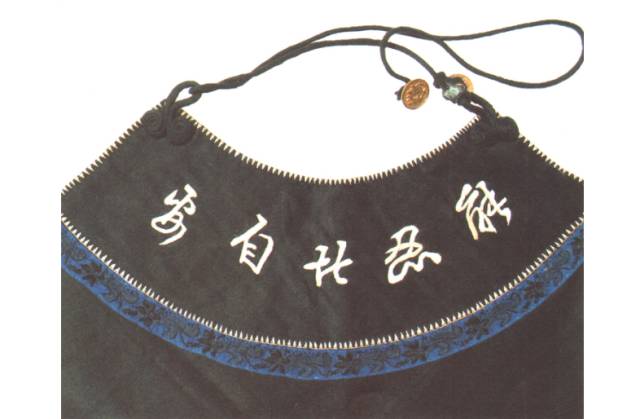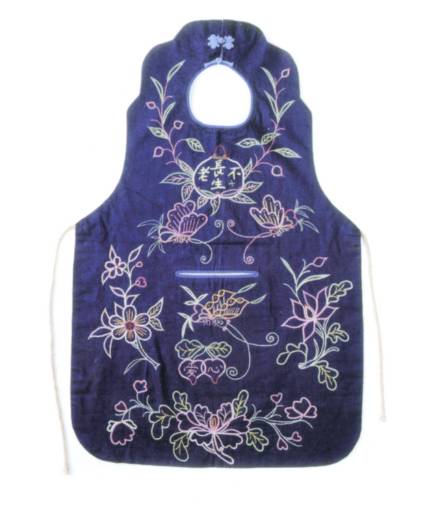 许多服饰或者服饰品上直接以文字表述“长生不老”和“长寿”含义。这是人性之使然,巴金说过“生”是美丽的,乐“生”是人的本分。动物不怕死,是它不知道有死这回事。怕死恋生,这是最正常最根本的人性。渴望生命长存,就是要做到民间文化中“积德行善”。因此,常常直接在围兜上绣上代表“善”的“爱心”,这样就可以使长寿的价值无限延伸和增值。