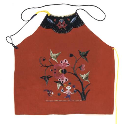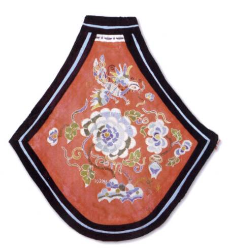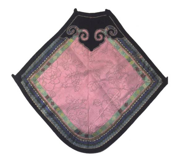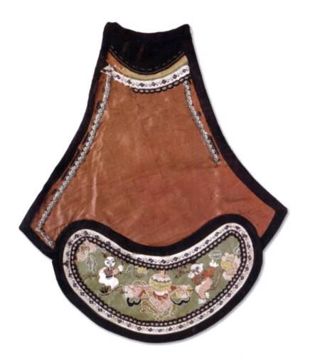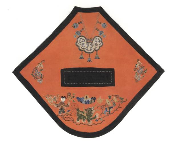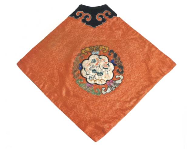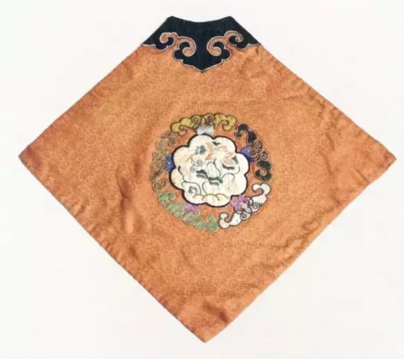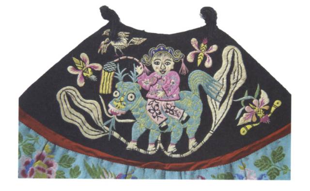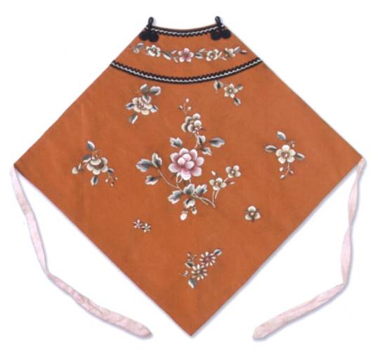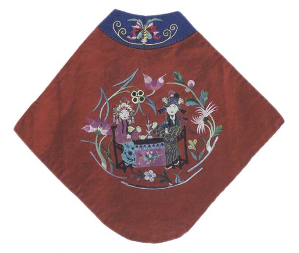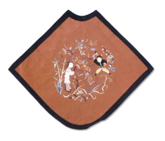 清代。此肚兜菱形,上半黑地,下半部分橘红色地上贴绣人物花卉纹,图案精美,做工细致,是中国服饰传世珍宝。
