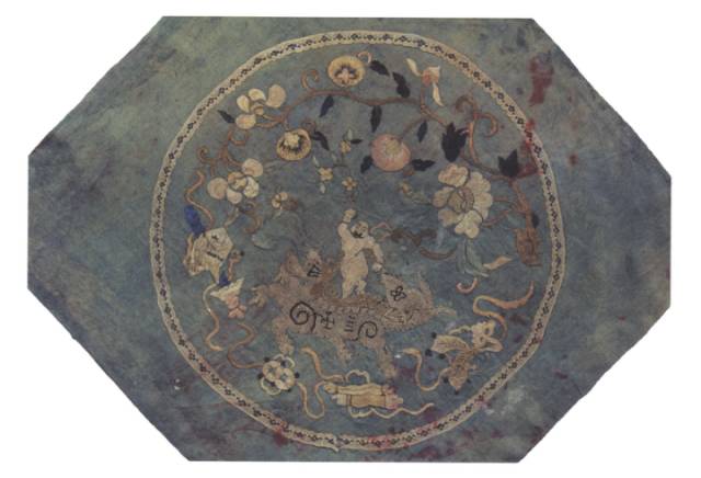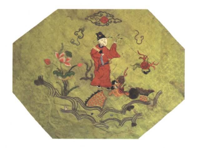 刘海蟾为道都人物,相传他见累钱之危而悟道成仙。其形象常被用作装饰纹样,寓意为放弃利禄,抛弃功名,粪土金钱。刘海蟾作童子状,身穿大袖之衫,两手甩穿钱之绳,戏钓三足金蟾,周围配以花树飞蝶。