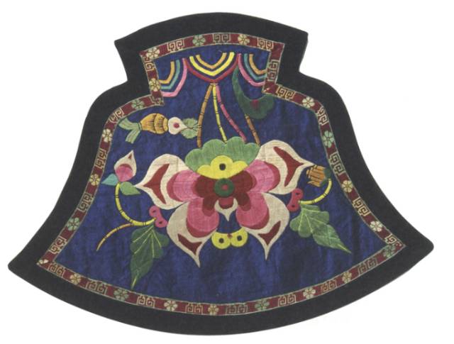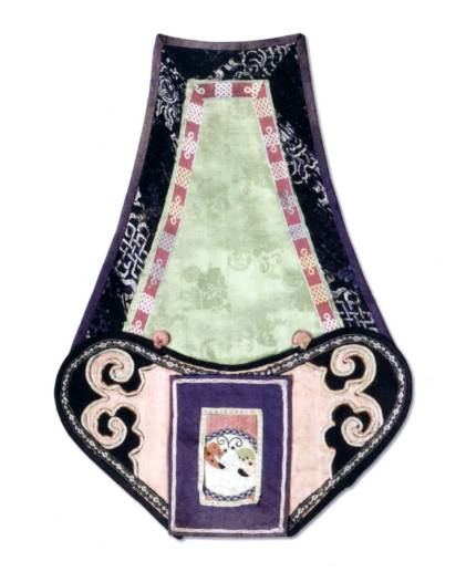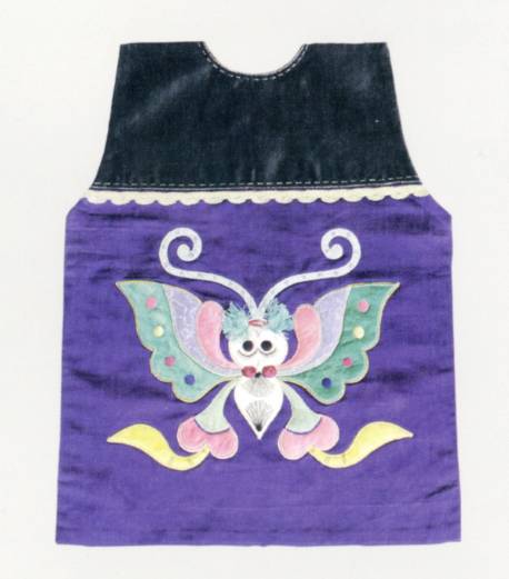 此肚兜为方形,上半黑地,下半部分紫地上贴绣彩蝶纹,图案精美,做工细致,是清代的传世珍宝。