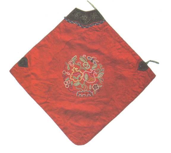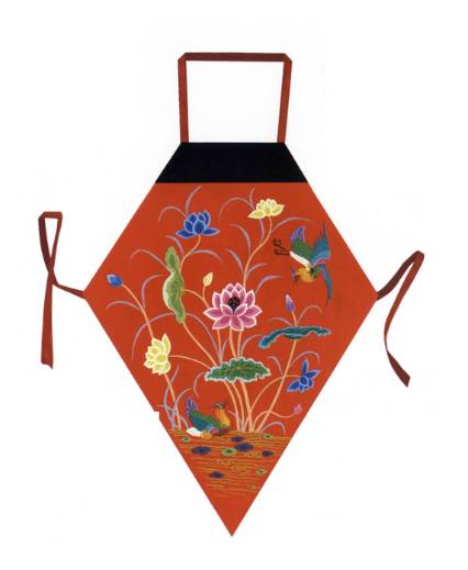 肚兜上端成凹形的浅半圆状,于两端钉带挂颈脖上,下角或尖或圆,横两角各设带扎于腰间,护住胸腹部,使胃肠不受风寒,兼有乳罩和裹肚的作用。兜面上大多有饰花,常见的有开口石榴、并蒂双莲、寿桃、鸳鸯戏水等表现美好情感与吉祥寓意的图案。