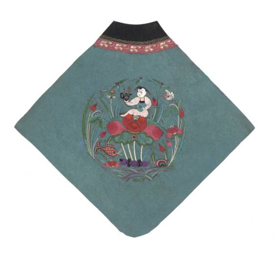 此肚兜为菱形,绣如意纹圆领,下端为尖角,橘红色地,中间贴绣五福连生贵子纹,寓意吉祥如意、连生贵子。