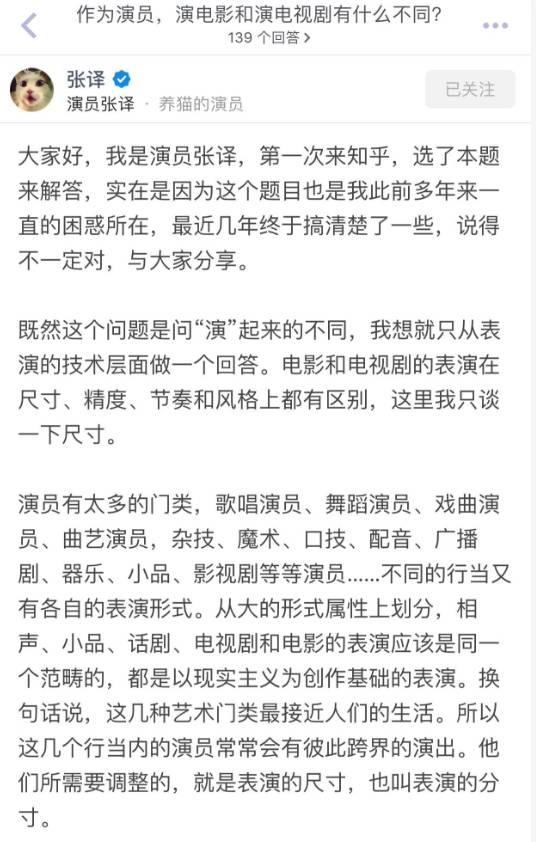 之前张译是因为回答了《作为演员,演电影和演电视剧有什么不同?》这个问题,在网络上引起不小的轰动,这也是他第一次在知乎回答问题——