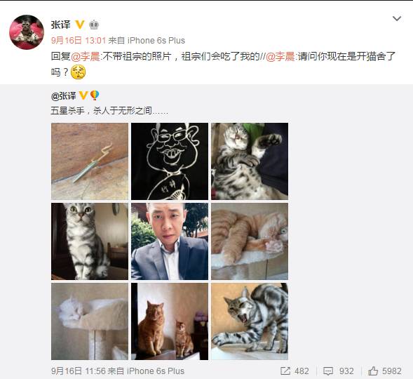 事实上,他养了7只猫,猫在他的生活中占据了很重要的地位,微博上分享的猫占很大一部分比例——