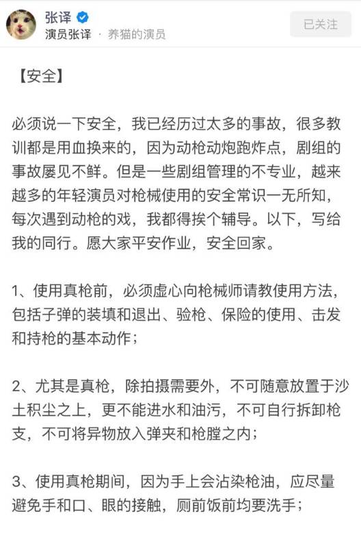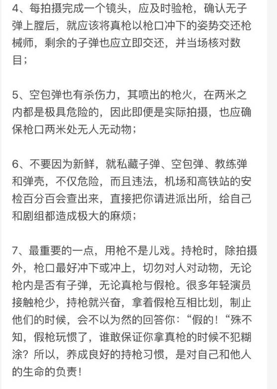 虽然专业,但是张译的回答内容丰富,文笔流畅,虽然很认真,但是很活泼,关于“枪”的问题,分门别类,一下子就可以让人了解演员用枪的各个方面,最后甚至给出了7条安全建议,真是良心——