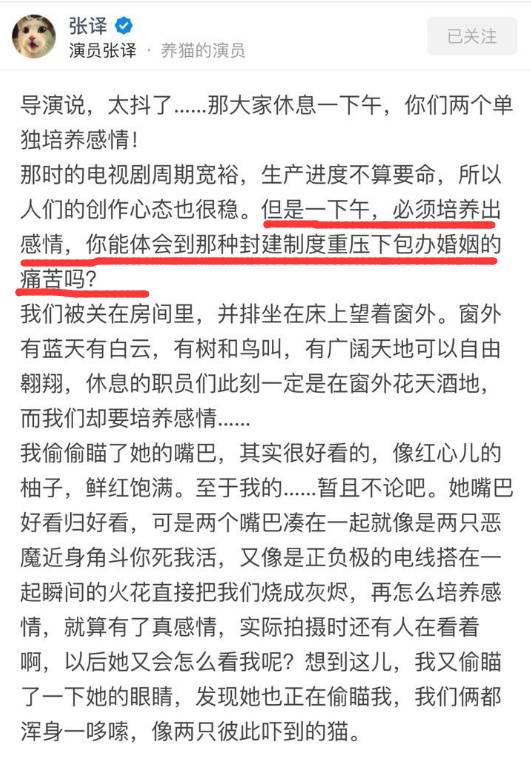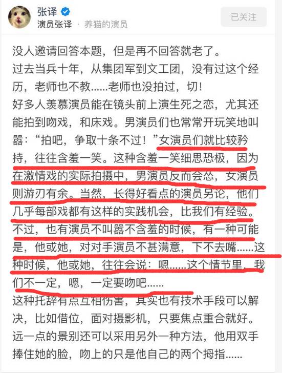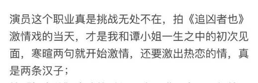 其实,一些吃瓜群众都很羡慕男演员能和不同的女演员演吻戏、演床戏,但在张译这里却有些挑战。光看张译描写不同的人对待吻戏的态度,就可以笑上半天——