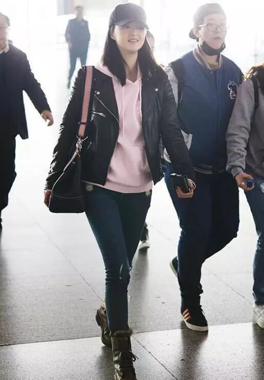 粉色连帽卫衣,穿起来更加可爱迷人,同时外搭一件黑色皮质外套,十分有型。镜头前格外迷人,被人们所喜欢。