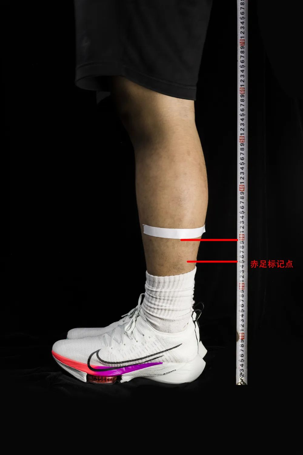 小编在小腿上进行标记后测量,首先记录赤脚时的标记高度,然后在测量穿鞋时标记高度,二者差值就是鞋款的增高数值。