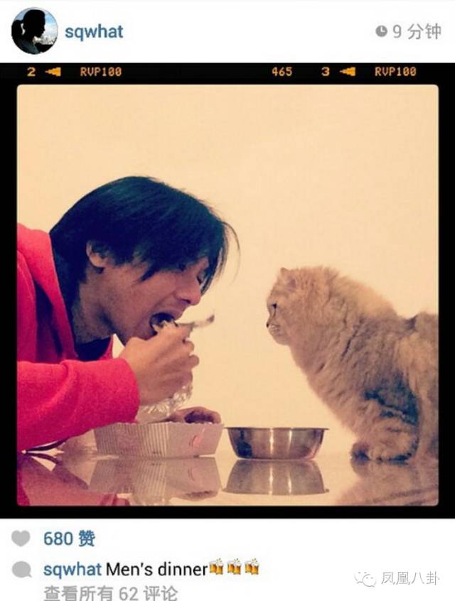 2014年3月凌晨,舒淇在Instagram上po出一张冯德伦与爱猫May May Boy对望吃饭的照片。