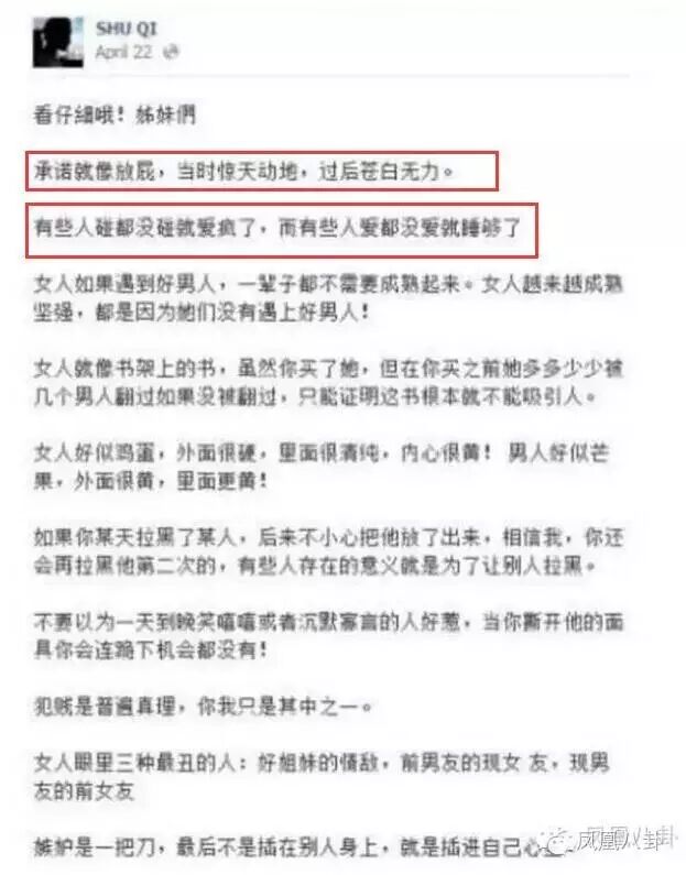 在众人纷纷猜测这是要公开恋情的节奏时,没想到2013年舒淇在生日那天发表长文写道:“承诺就像放屁,当时惊天动地,过后苍白无力。现在的我,你爱理不理,记住了,以后的我,你高攀不起!”这段狠话疑似指向冯德伦。