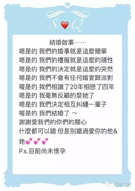 这则结婚启示透露:两人相似20年相恋了4年,目前舒淇尚未怀孕。