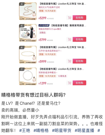 “晴格格”王艳复出:15亿豪宅没了,贵妇人设崩塌 黎兜兜 内地女星 2023-08-21 21:16:08 274 创作不易,用心坚持,欢迎请BaGua喝几杯爱心咖啡!打赏并支持本文 打赏并删除本文 文丨她姐来源 | 她姐生活ID | tajie7980149岁的“晴格格”王艳,罕见露面,为直播带货铺路。先是开了场直播预告卖货,与粉丝聊天,谈谈过往引以为豪的角色,谈谈近况如何。王艳坐在自家后花园前,气质依旧温婉大方,但早已49岁的王艳,镜头里眉眼间的疲态和纹路清晰可见。王艳为了直播卖货,其实准备了很久。从入驻抖音,拍摄变装视频勾起粉丝回忆杀,到拍视频分享好物,一步步,积攒粉丝量。最终抢占明星直播卖货的风口,加入明星直播卖货的大部队中来。明星图利,跟随大势,弃大荧幕转战小镜头,走上直播卖货之路无可厚非。但王艳如此,属实让一众网友震撼。王艳什么背景?年纪轻轻嫁给了北京地产大亨王志才,住在故宫旁边的王府世纪大厦15亿豪宅里,正当红时退圈专心做富太太,过着令人羡慕的豪门贵妇生活。曾以11.2亿进行拍卖在旁人眼里,她不缺钱,根本不需要“下场卖货”。加之,王艳本身性格内敛,并不适合大多数吆喝式的卖货方式,最终选择模仿董洁“慢节奏、治愈系”的带货风格。只不过董洁的成功可以复制,却不容易复制。从网友的评价看,王艳的直播卖货之路走的也并不顺当,被质疑:眼神飘忽,口条不顺畅,产品介绍不清楚,单靠刷脸,没有带货功底。加之,选品小众,且价格昂贵,动辄上千块的小众品,普通人难以承受。可想而知,最后的成效并不尽人意。王艳此次卖货翻车,连带着个人口碑滤镜,也一并受损。02人生浮沉,世事难料,王艳曾何等风光。玲珑秀气,温婉可人的长相,尤为贴合古装扮相,可娇、可柔、可艳、可冷、可狠……在古装剧风头正茂之时,王艳实在是个“香饽饽”。《还珠格格》第一部时,琼瑶还专门邀请她饰演“金锁”一角,只不过因王艳需要照顾病重的婆婆,最终辞演。《还珠格格》第二部才出演了“晴格格”一角,没想到这个角色将王艳的事业路推上高潮。比起紫薇小燕子的主角光环,深宫中长大的晴儿,有大家闺秀之范,却并未被规矩体统束缚,她内心热血奔腾,向往自由潇洒,外在亦有自己的清冷与孤傲。满腹诗书、聪敏机智的晴儿,一度成为了大家心中的“白月光”。紫薇给尔康,我选晴儿而当年,王艳留在观众心中的惊艳古装扮相又何止“晴儿”一个。《武林外史》里的白飞飞,一生飘零,为复仇而活,最终遗憾香消玉损,在王艳的表演下,狠绝又楚楚可怜的双面幽灵宫宫主的形象跃然纸上;来源B站:颜--颜《聊斋之花姑子》里,她是知书达理的闺阁千金钟素秋,至情至性的人设与人比花娇的妆造,即使女一张庭,都盖不住她的风光;来源B站:bili朵儿还有《无敌县令》里的凝香;《情深深雨蒙蒙》里打酱油角色萍萍;《烟锁重楼》里的曾靖萱;《少年张三丰》里的赵玉儿;《青河绝恋》里的万秋玲。同是古装,却各有各的美,每个角色丝丝入扣,各有各的灵魂。那时,观众还记不住王艳的名字,但“晴儿、白飞飞、钟素秋、萍萍……”单伶出的角色名,都令人念念不忘。可惜的是,王艳算的上是娱乐圈早一批“英年早婚”。嫁入豪门,享受着富太太生活,本就无心在事业上争个大红大紫。2005年,王艳怀孕后,便无惧正当红的流量机会,渐渐淡出娱乐圈,开始相夫教子,错失了借势而上的最好时机。虽享有泼天的荣华富贵,但外界对王艳的选择依旧惋惜,无非是因为:一是王艳有演技,有颜值,如果没有淡出圈,如今一线地位绝对有她一席之位;二是王艳被曝光的豪门生活,并不如意,全身心回归家庭照顾儿子球球,却没换来理解,反被吐槽:“我爸赚十几万,她花一半;妈妈不如爸爸大气,零花钱就给1千,爸爸给2、3万。”儿童戏言,身为母亲的王艳听着又该有多难过。而近年来,据媒体爆料,王艳老公欠千万赌债,公司股权冻结,被限制高消费,15亿豪宅也被曝拍卖,疑似破产,王艳替夫还债,才逐渐复出,走上豪门贵妇的带货之路。网友们揣测王艳日子不好过,具体情况为何,谁也不知。但在直播带货风口上,豪门贵妇带货风潮,不止王艳,口碑更是良莠不齐。03闹得沸沸扬扬的要数向太陈岚带货。向太陈岚(郭碧婷婆婆)中国香港制片人、经纪人、投资家、中国星电影公司副主席。和老公向华强,一起创办了“中国星”电影公司,拍出了许多卖座佳片,公司经营兴盛无比。家中资产殷实,上亿的珠宝收藏,不计可数,豪门贵妇名副其实。可如此的身份、地位、家境,看到了直播卖货的风口,也想杀进直播间,夺一杯羹。甚至带着半个娱乐圈来宣传,巩俐、甄子丹、古天乐、陈小春、张智霖、黄晓明、陈鲁豫、刘嘉玲……大咖云集,是贺岁片都聚集不了资源。不过,最终却是雷声大,雨点小,反招一身恶评。有别于视频中,向太分享日常精致奢侈生活,晒收藏的宝石钻戒,向太的直播间下沉市场,卖的都是消耗大,需求大的日常用品,牙刷、纸巾、洗衣液、面膜、9.9元的暖宝宝贴等。而对于这些低价品,向太的态度是拧巴的,作为主播的向太,几乎拒绝讲品,只负责说下价格、优惠机制,便直接过品,只有助播在旁口若悬河的介绍。主播在介绍面膜时,为了讲产品效果的可信度,就说连向太都在用,一旁的向太,捏了捏面膜,露出了一丝讥笑,一言不发;产品试吃环节,向太一口不吃,还调侃一旁的助播小心拉肚子;面对这些自己很陌生的产