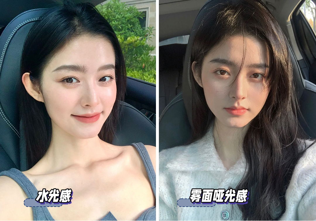 像水光感十足的底妆,虽然很显皮肤状态好,但是上镜的质感比较差,对骨相和瑕疵皮姐妹来说没那么友好。