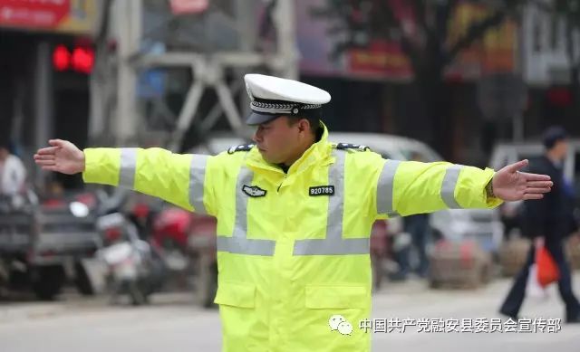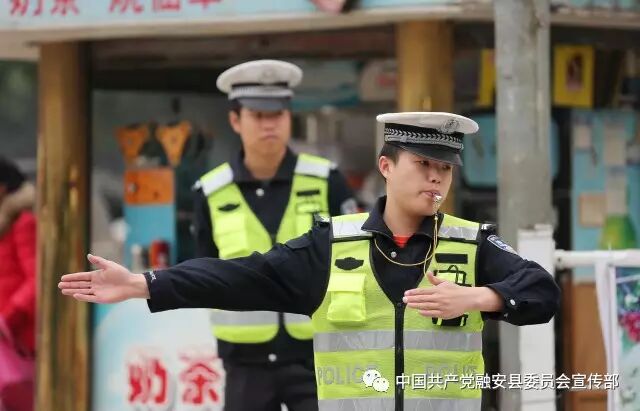 2017年1月1日,在广西柳州市融安县融江南路,交通民警陈君在指挥交通。(谭凯兴 摄)