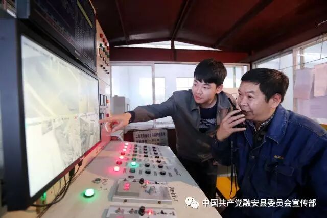 2017年1月1日,在凤糖集团广西柳州市融安制糖有限公司生产车间,班组长李健(右)和徒弟在检查设备运行情况。(谭凯兴 摄)