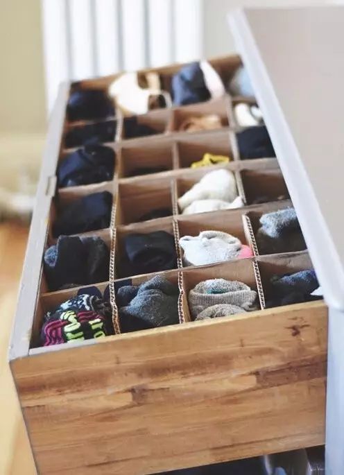 像背心、T恤这类比较薄的衣物也可以用分格抽屉进行整理,用平时包装用的瓦楞纸做成纵横相间的隔板更方便放置。