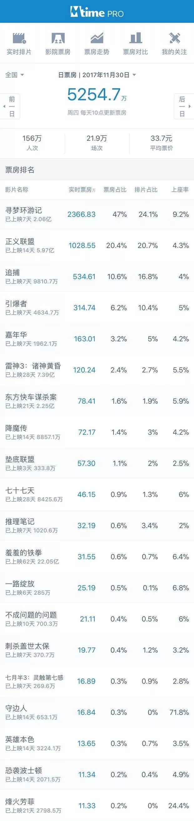 11月30日内地票房报收5255万,由于《寻梦环游记》等片票房走势稳健,上周工作日大盘差距不大。随着11月结束,11月内地票房最终以28.77亿的成绩收官,创造了新的11月票房纪录。截至11月30日,2017年内地票房已累计达507亿。
