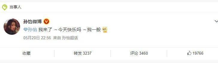 在所有娱乐圈情侣狂撒糖的5.20节日,孙怡当天发微博说“今天快乐吗~我一般。”
