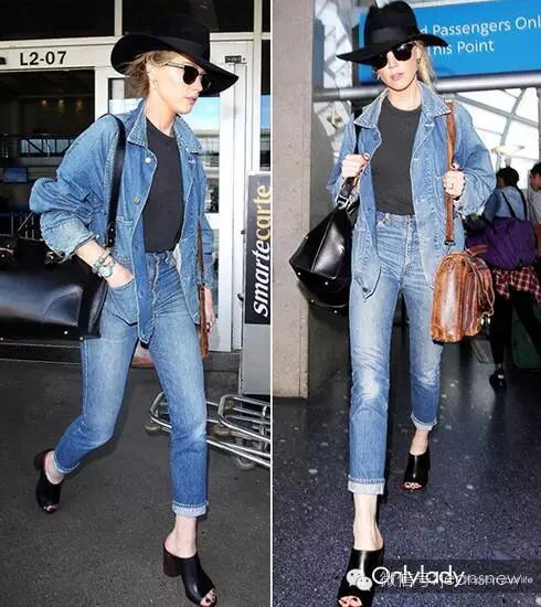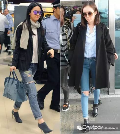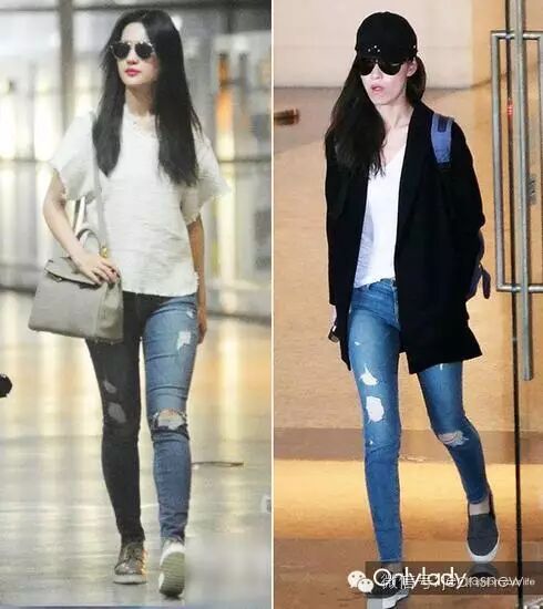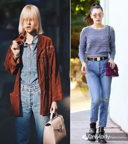 但同样是蓝色仔裤,美腿效果和时髦指数可以有十八条街的差别。比如,我们经常看到这样的效果。(刘亦菲和倪妮的仔裤是同一款,来自Frame Denim,售价115英镑)。
