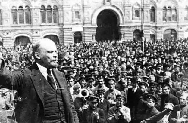 ▲“十月革命期间”,列宁在一个群众集会上发表演讲