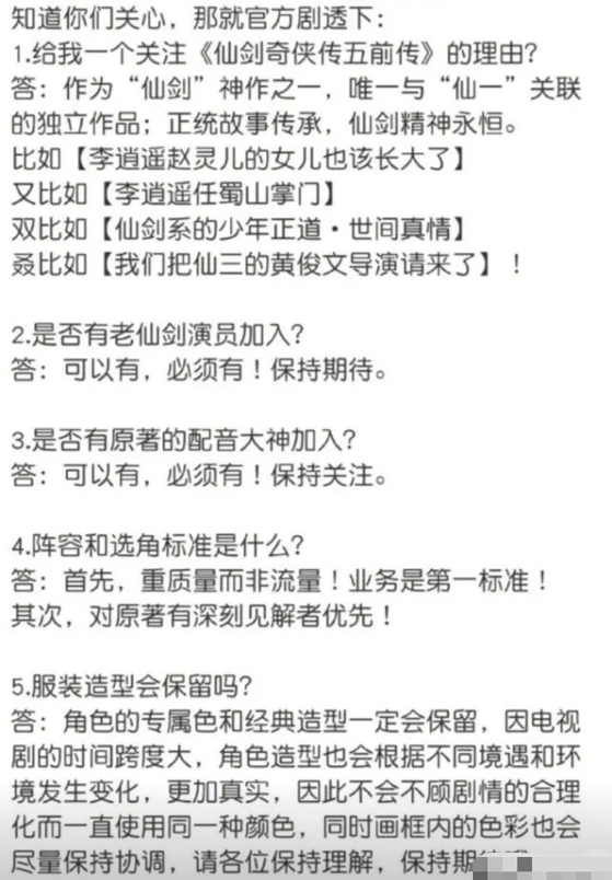 大家对于仙剑五讲述的内容和演员的阵容等等问题都非常好奇。官方也对部分问题作出了回答,如不仅会有老仙剑演员加入仙剑五,还有一些原著的配音大神们也会加入。官方表示选角的第一标准是业务,还会保留角色的经典造型。这真可谓是非常有心了。