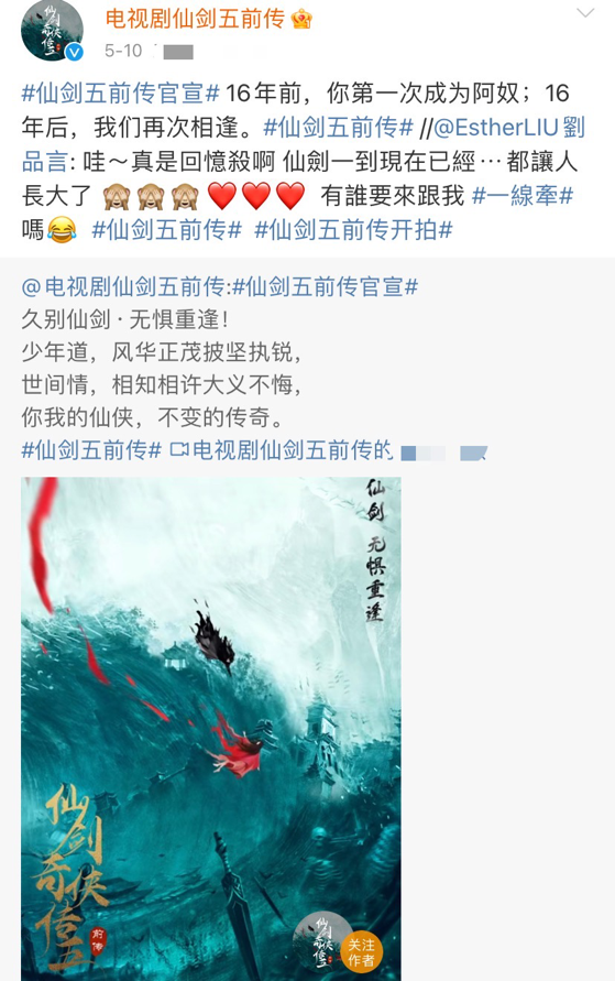 官宣在配文中说:“16年前,你第一次成为阿奴;16年后,我们再次相遇。”非常有情怀,也勾起了不少人的美好回忆。