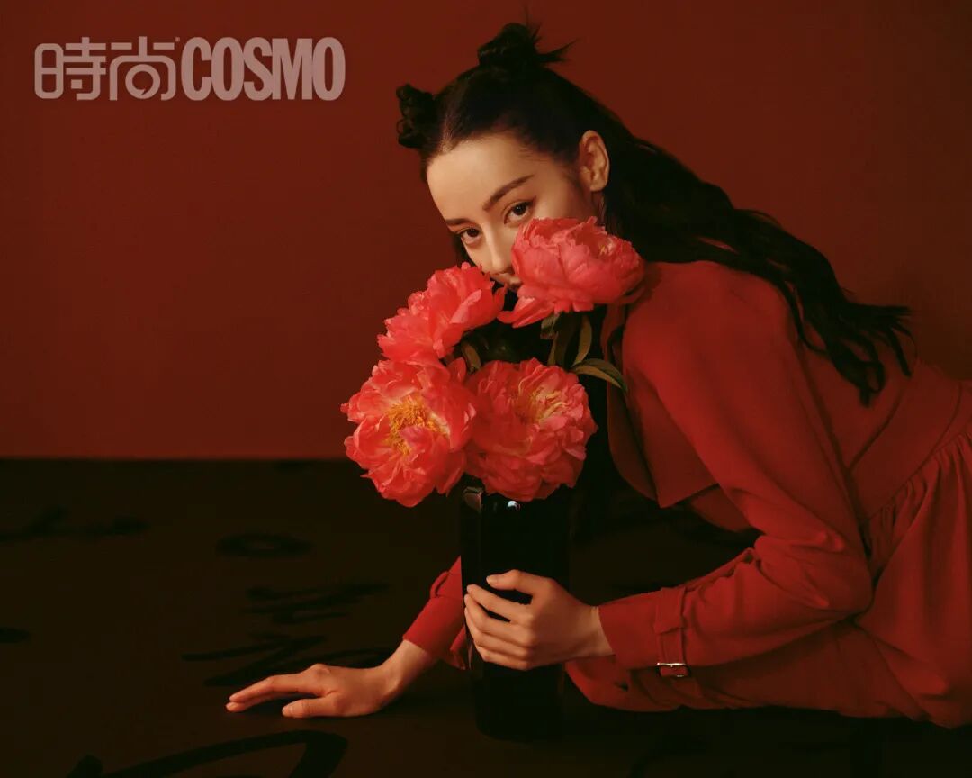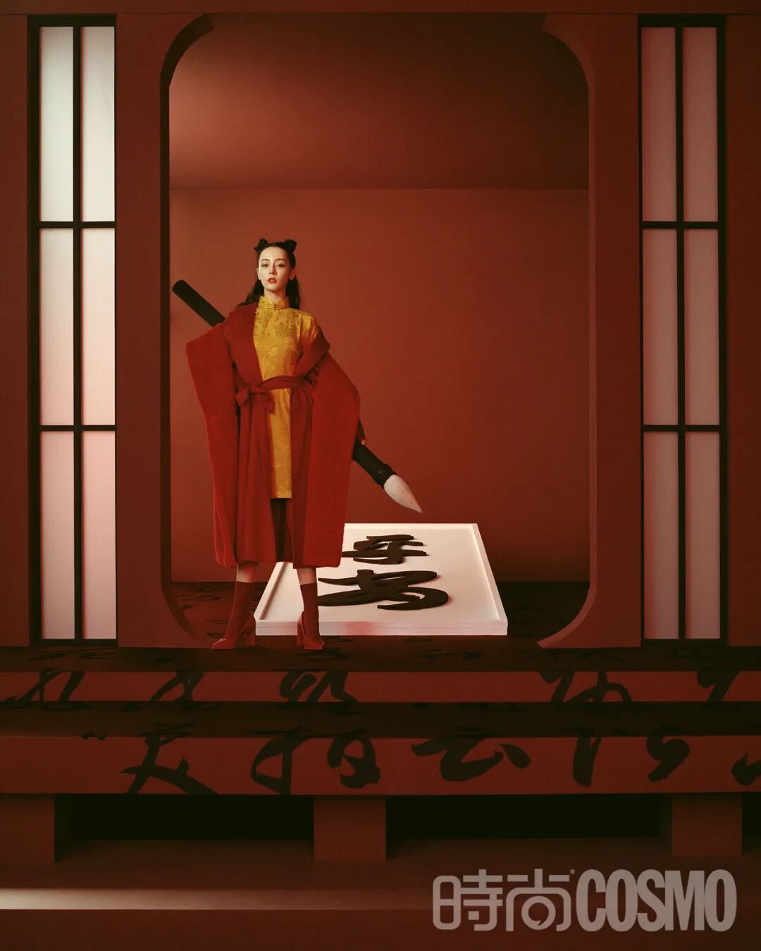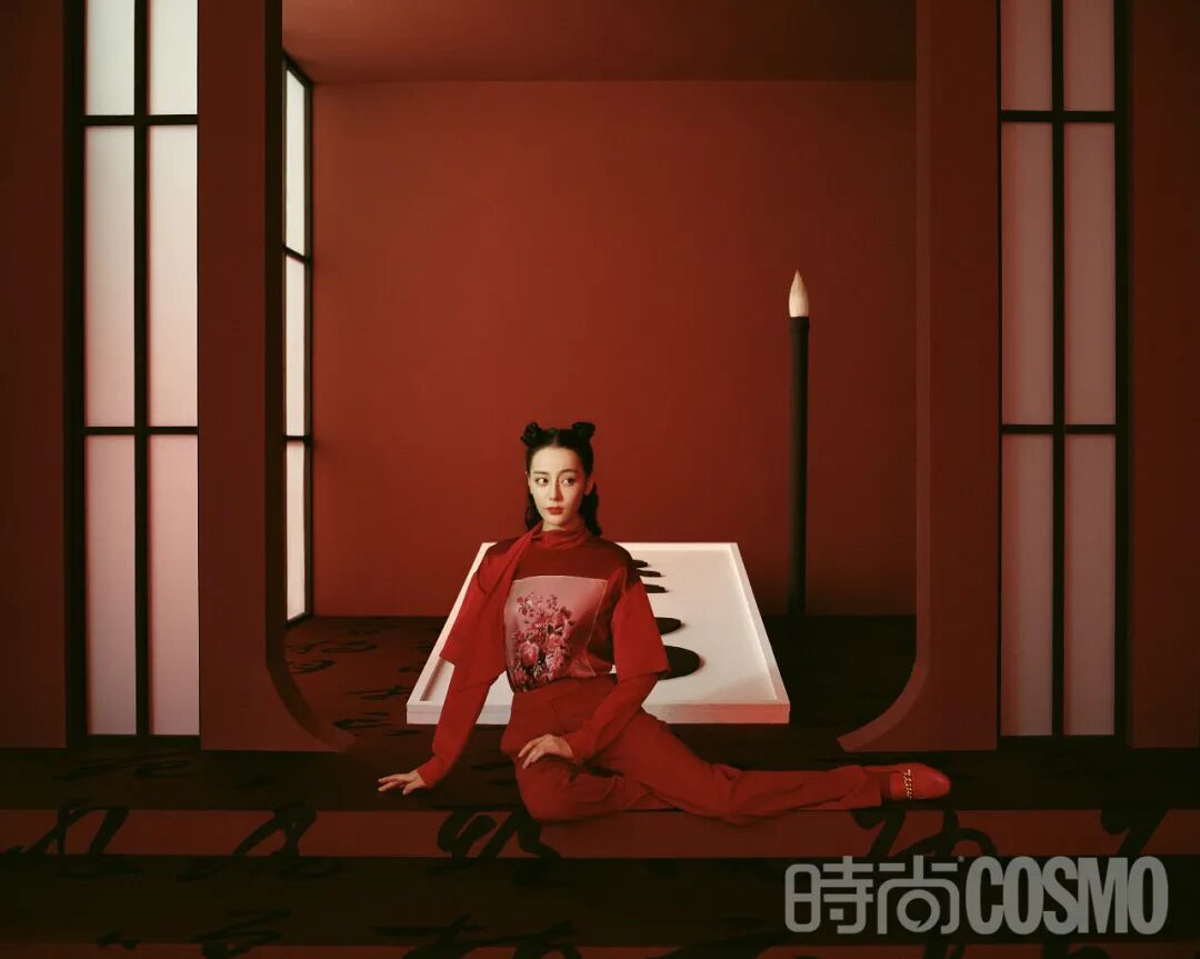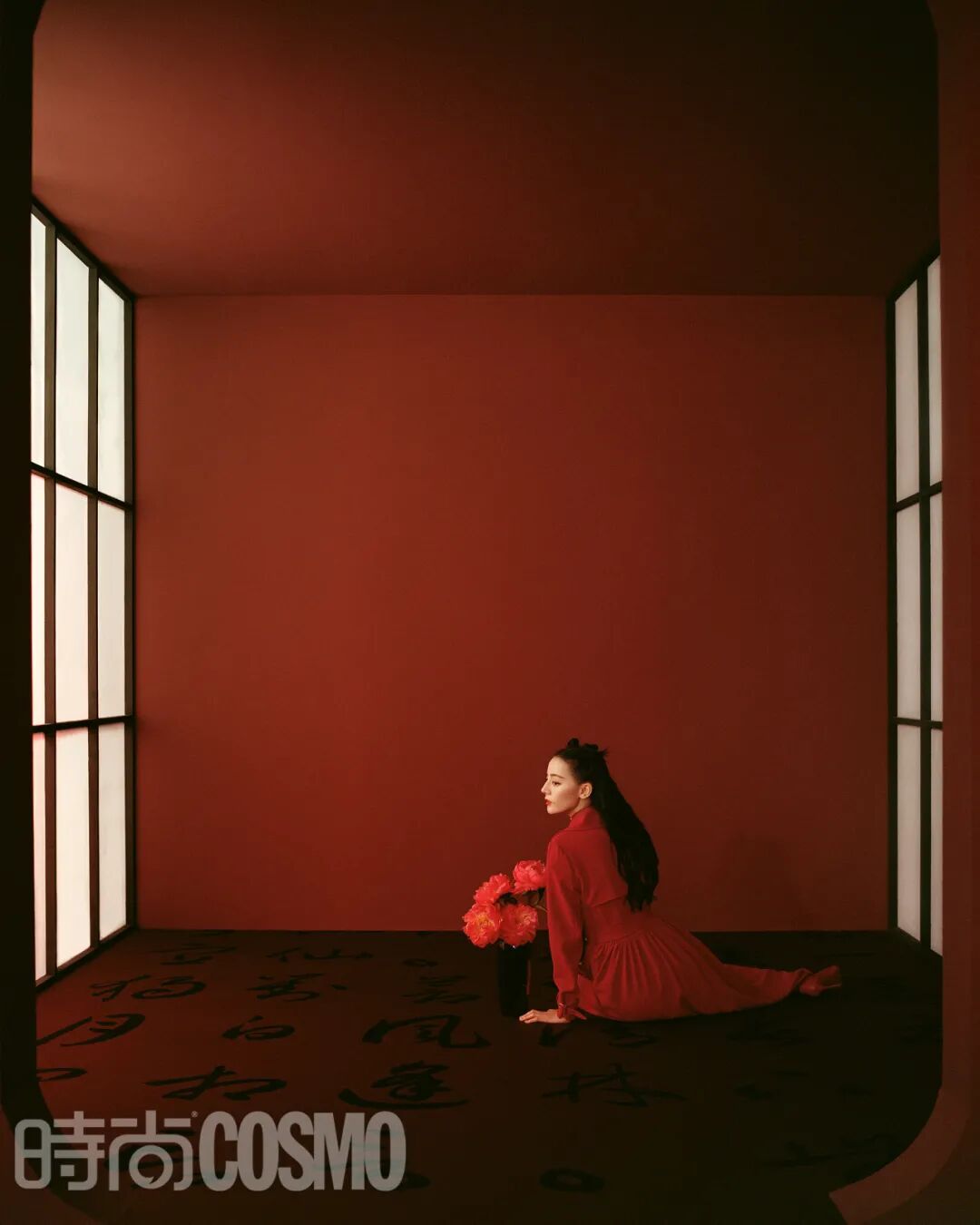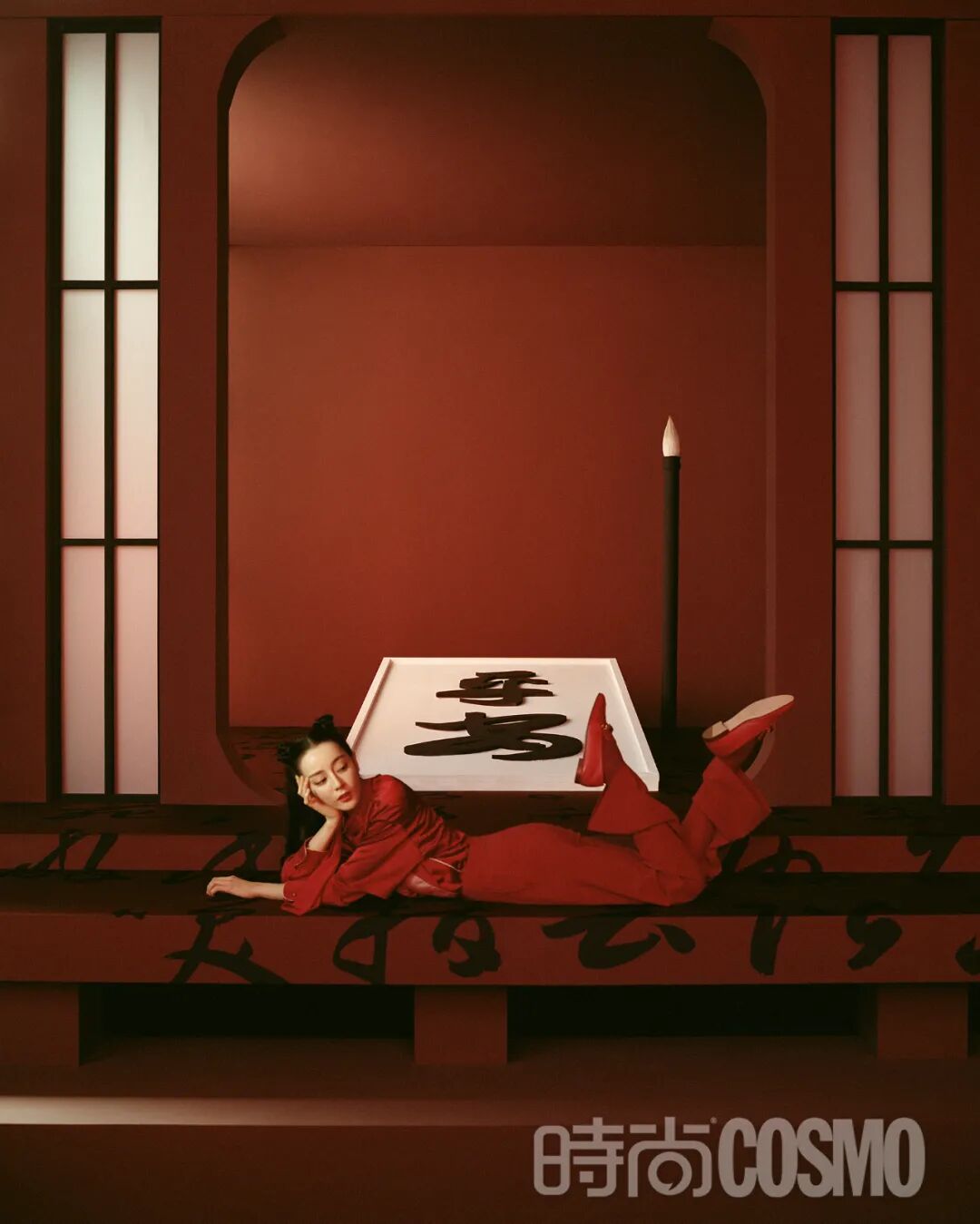 红色丝绸短袖、红色直筒长裤、红色平底鞋 ▍