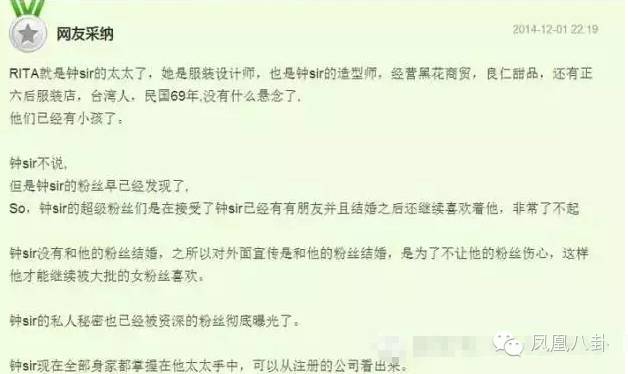今年年初,钟汉良因为《何以笙箫默》大火的时候,网友“CL-中国娃娃”的微博爆料,再次将钟汉良隐婚的事推向热点。爆料称,钟汉良“背后的女人叫rita,中文名谢易桦,rita对外的身份是钟的服装造型师。钟汉良2010年视觉动物专辑造型是她做的。”