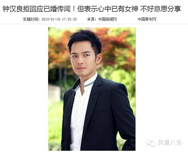 接受采访被问到“有传言你已经结婚生子了,这是不是真的?”,他的说法就是”小道消息,不要信“,之后回应隐婚,钟汉良最常说的就是这一句。