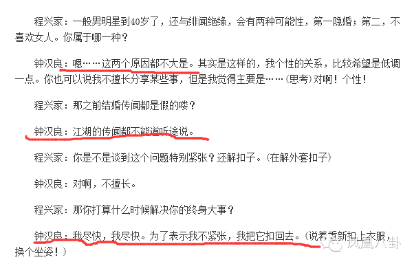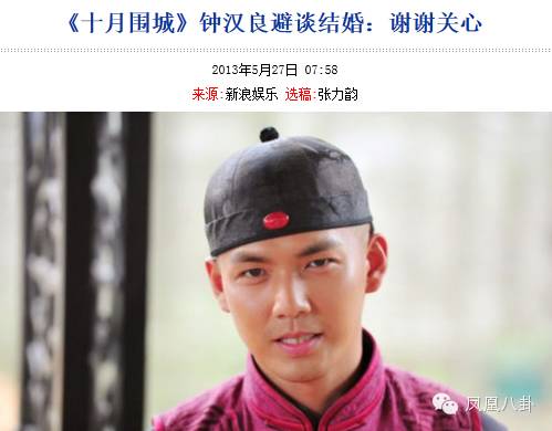 13年5月,媒体探班钟汉良《十月围城》,当时也正值钟汉良隐婚传闻甚嚣尘上之时。接受群访时媒体抛出了“你现在是结婚了吗”、“为什么这个问题一直不回应?”、“什么时候能公开?”等问题,针对一系列关于结婚的问题。