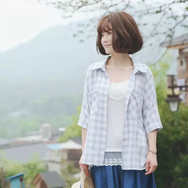 简约七分袖百搭宽松上衣格子衬衫↓↓↓