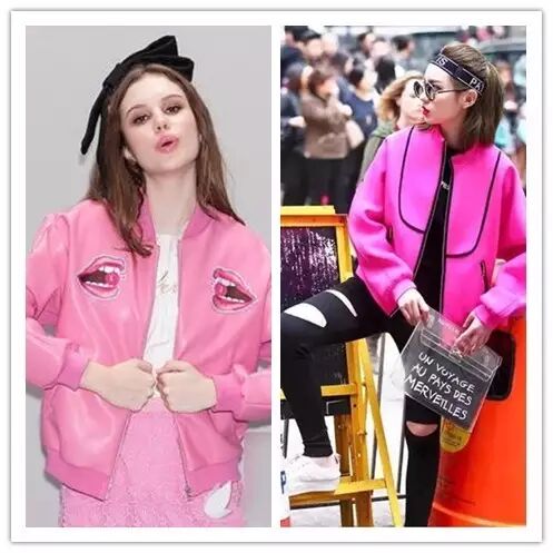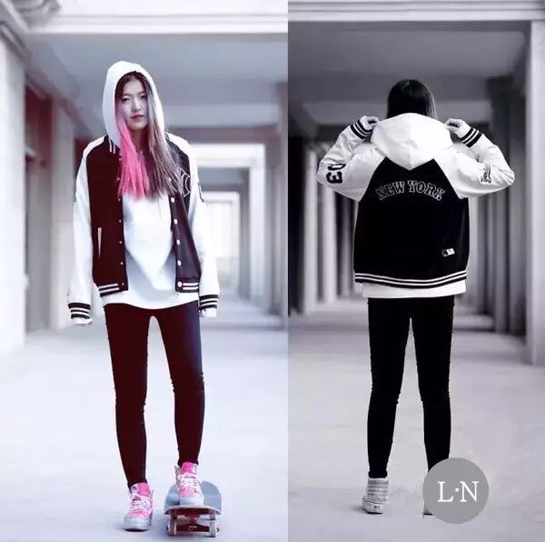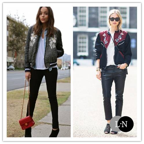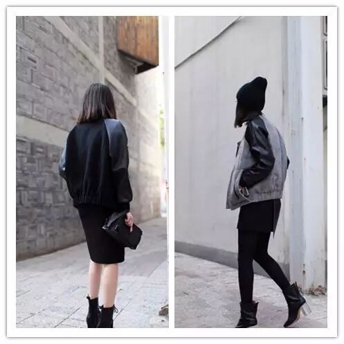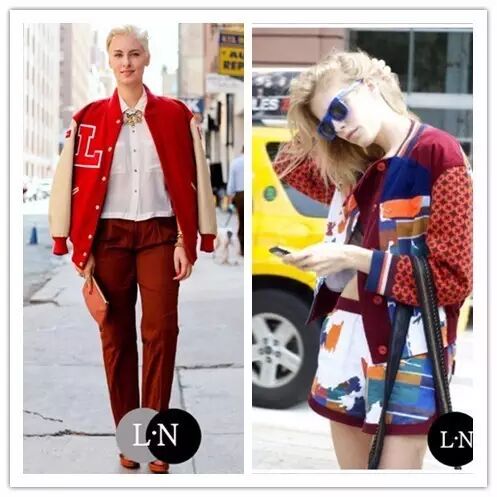 小编歪想 棒球夹克取代了大衣。可搭配破洞牛仔裤、皮裤等,或搭配短裤,露出大长腿,会很时髦。