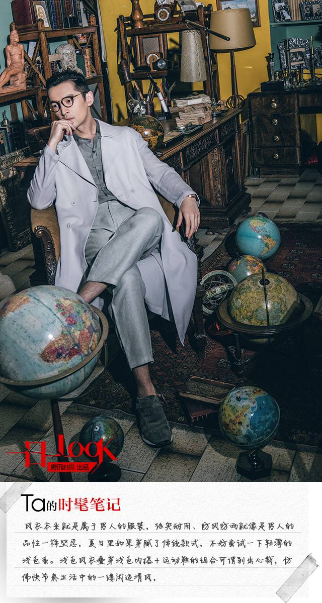胡歌在他的时尚笔记里面写道:风衣就是专门为男人制作的。男人般的坚韧就跟风衣的品质一样,防风风雨,结实耐用可靠。夏季里如果想穿风衣不如尝试一下轻薄款的浅色系风衣,搭配运动鞋,仿佛快生活里的一缕清风闲适,别出心裁。