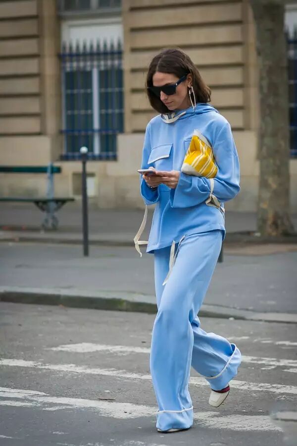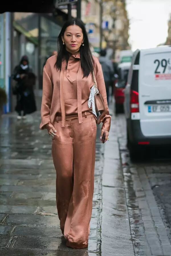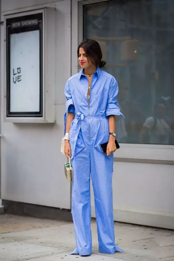 而蓝色衬衫搭配深蓝色拖地裤这类同色系的组合更是高级,面料色调的差异打造丰富的层次感,且永远不会出错。