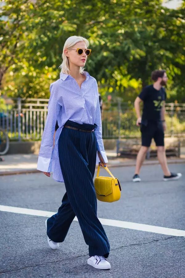 一件拖地长裤加上衬衫,早秋的上班族们就可以美美的穿着去上班啦~衬衫的选择上,更有男友力的衬衫板型会让你更加帅气。