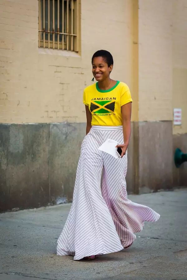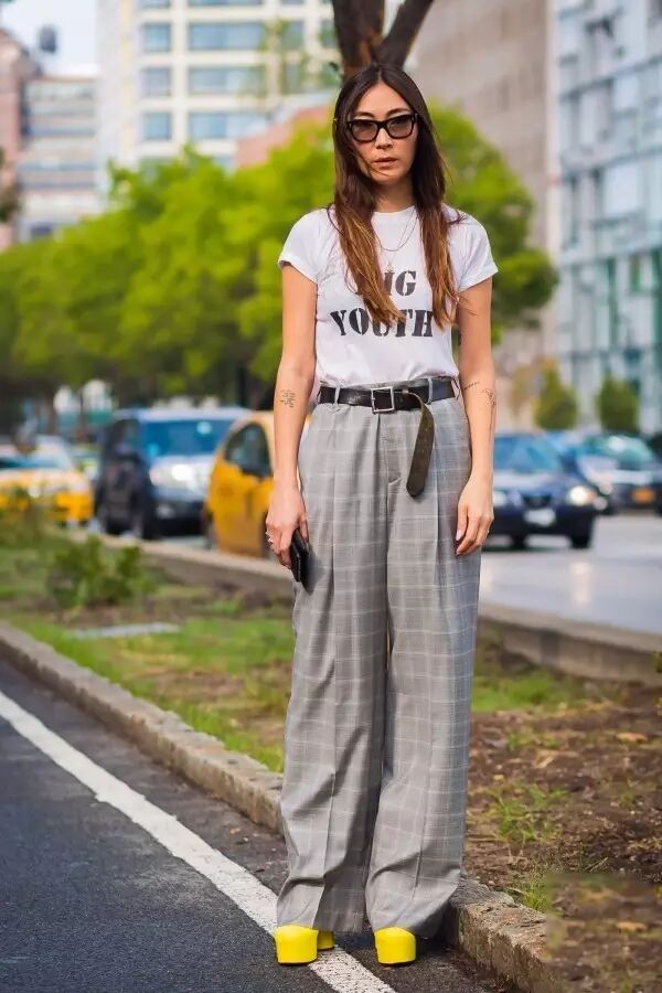 喇叭状的宽腿拖地裤,走起路来脚上生花,浅色的裤子,搭配亮黄色的T恤,超级吸睛啊~