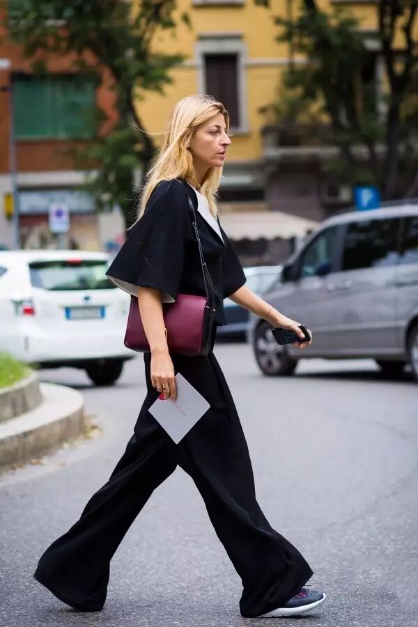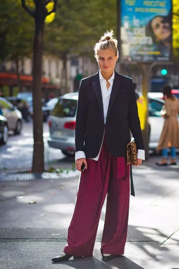 其实西服不一定专属于职场,将西服混搭拖地长裤,西装的帅气也丝毫不减。酒红色的宽松拖地裤搭配黑色西服,丝毫没有违和感。