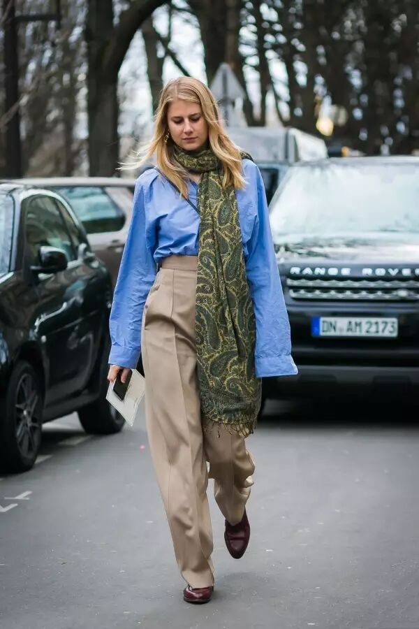 蓝色衬衫搭配卡其色拖地裤的对比色穿搭有气质且容易吸引眼球。