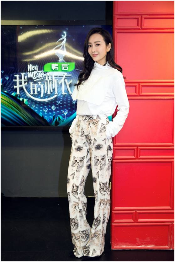 王鸥穿上小花猫图案的拖地裤搭配白色上衣,亮眼的下半身被拉长比例,看起来非常有气质。