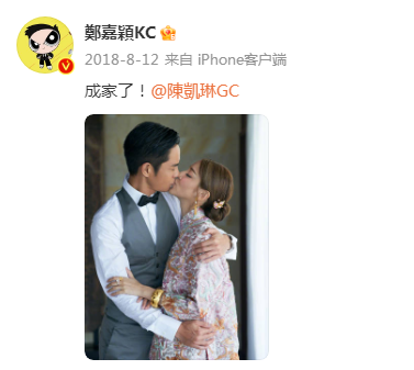 2018年,相恋3年的两人走进结婚礼堂。婚礼上,陈凯琳对郑嘉颖说:“多谢你,因为你让我懂得了幸福。我跟你在一起的每一天,都觉得很温馨、很有爱、很有希望。多谢你,带给我无与伦比的幸福!”