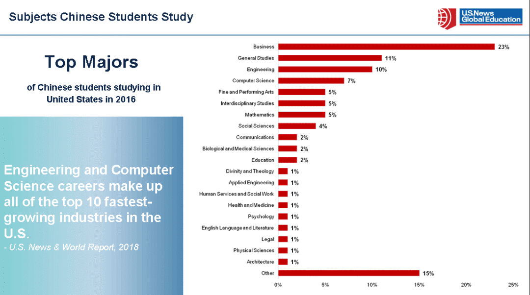 根据2018 US News&World Report 调查数据显示,最受中国学生青睐的前三个专业分别是商科、通用研究和工程。由于其就业前景广阔、整体薪资水平高,自然是吸引着众多学生的争相选择。
