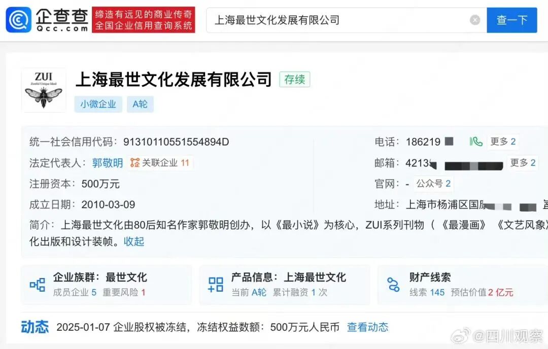 企查查App显示,近日,郭敬明新增一条股权冻结信息,被冻结标的企业为上海最世文化发展有限公司,冻结数额为500万元,冻结日期自2025年1月3日至2028年1月2日,执行法院为北京市朝阳区人民法院。