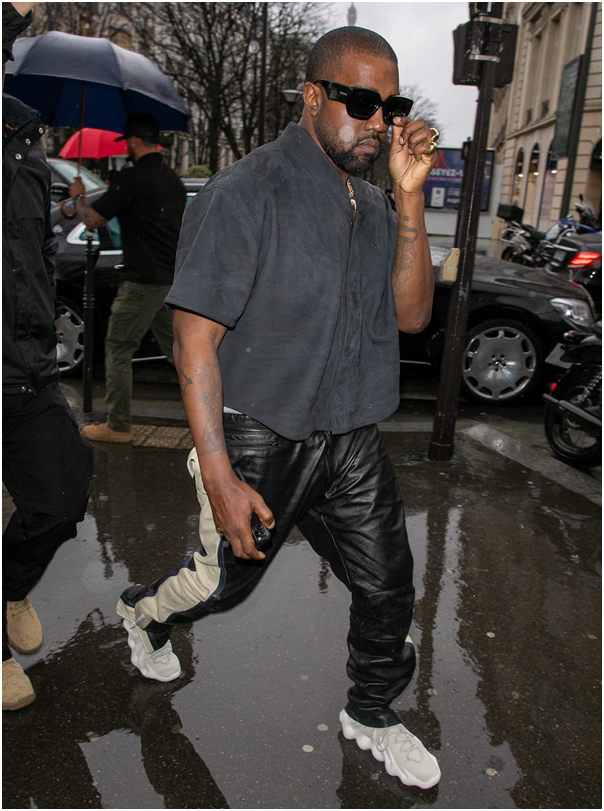 他的造型依旧超越了普通穿搭的范畴,他将自己全身统一成为一个色系。充满了包裹感,就像是新球鞋Yeezy Knit RNR一样,完全的一体化,完全的包裹感,没有额外元素的打扰。球鞋的尺码印刷在脚踝处,非常直观的展现自己的尺码。这可能是Kanye从Balenciaga创意总监Demna Gavaslia那边学到的新方式。反正已经没有了传统的鞋舌等结构,那么反而彻底一点,将尺码放在更明显的位置上。
