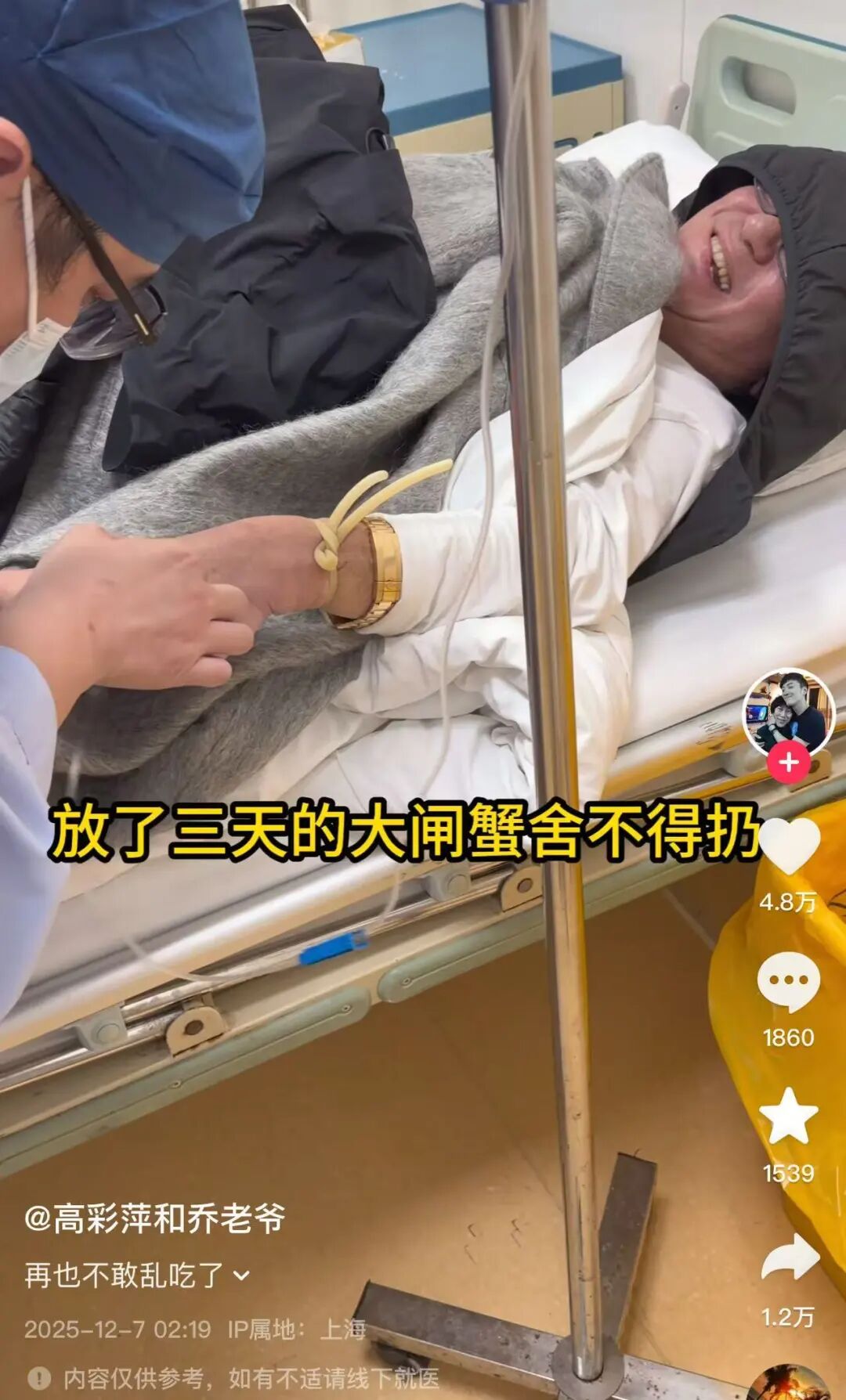 近日,乔任梁父母在社交账号发布视频,称乔任梁父亲因舍不得丢弃家中已存放3日的大闸蟹,食用后出现不适,入院了。