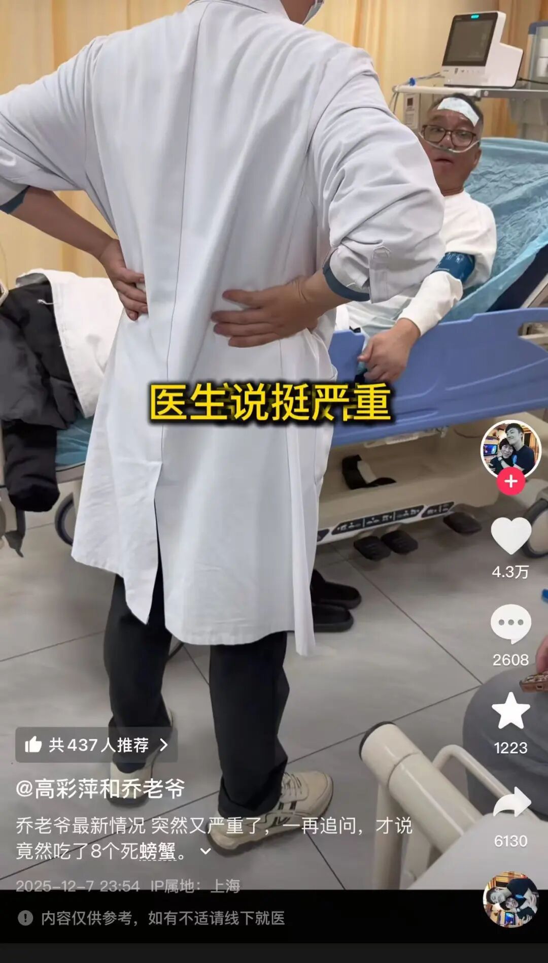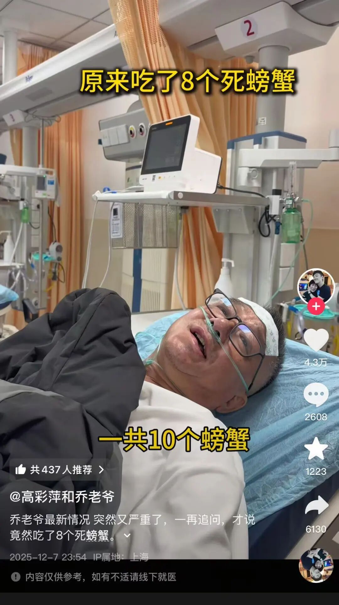 视频中,他透露10个螃蟹,吃了8个死的,医生说挺严重,需要住院。