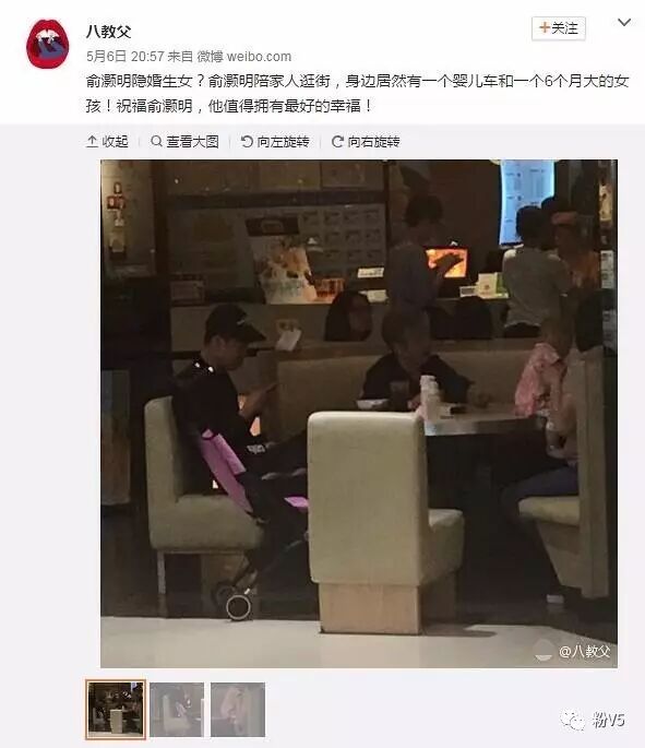 日前,一张俞灏明陪伴家人的照片在微博上被曝光,并附文:“俞灏明隐婚生女?俞灏明陪家人逛街,身边居然有一个婴儿车和一个6个月大的女孩!祝福俞灏明,他值得拥有最好的幸福!”该微博一经发布,就吸引了大量网友的关注,也为俞灏明惹来隐婚生子传闻。