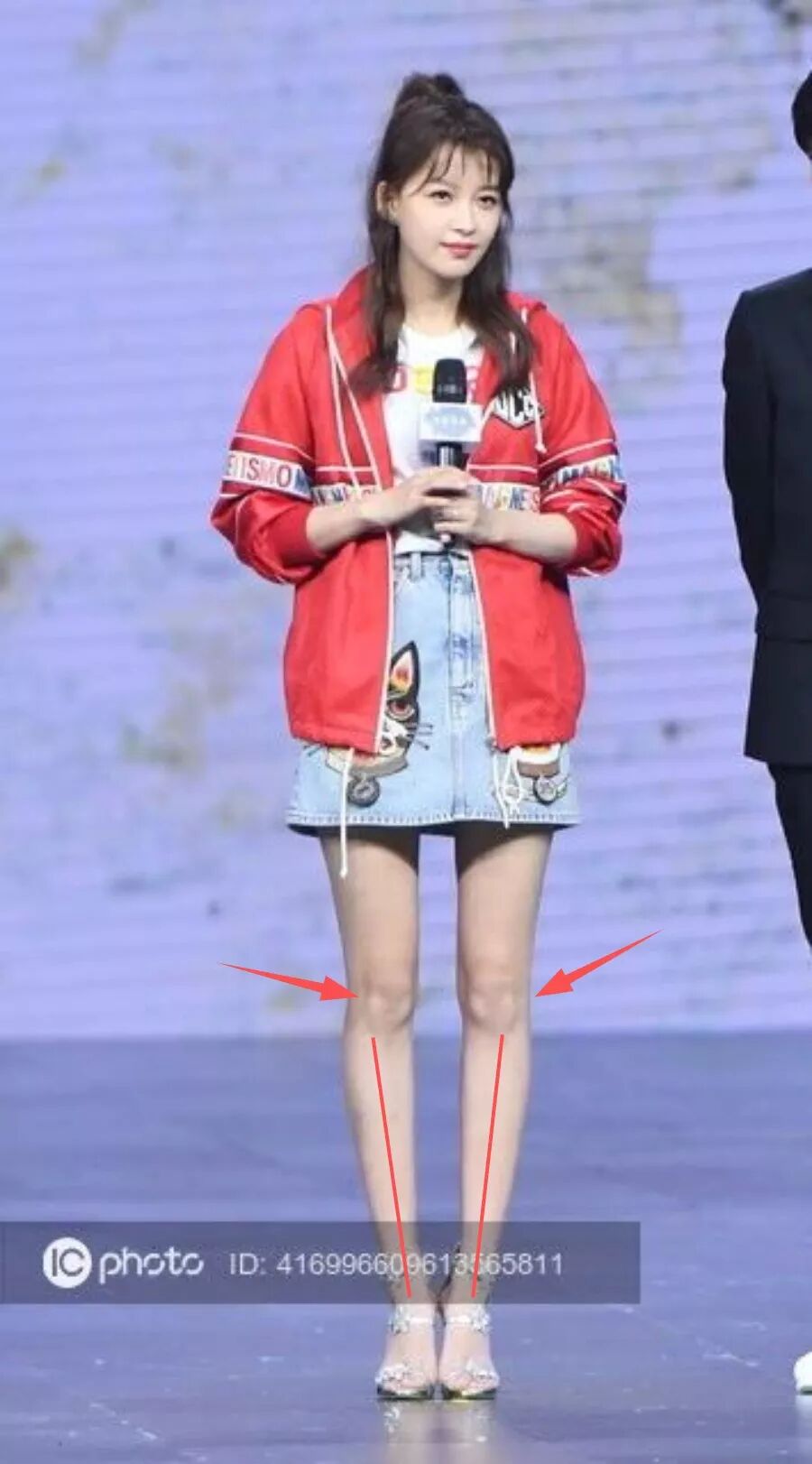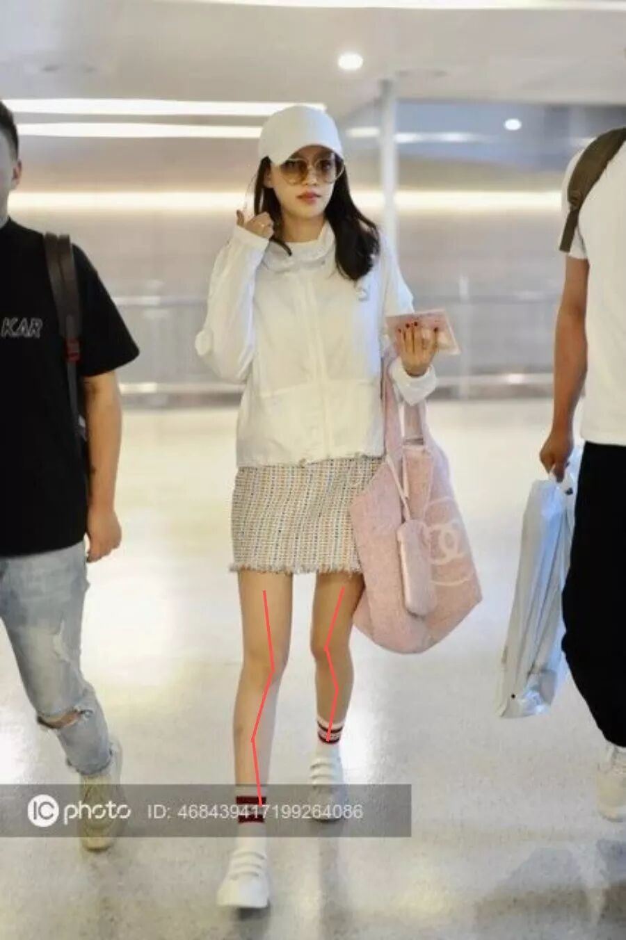 再回头看孙怡,膝盖向内,胫骨(小腿)分得很开,这就是妥妥的XO型腿。
