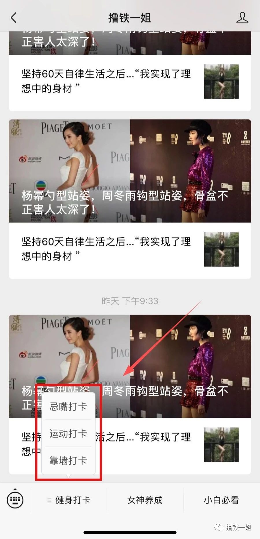 仙女们也不要忘记每日打卡,现在一姐的菜单栏有忌嘴打卡、运动打卡和靠墙打卡,走过路过不能错过,一姐就等你了~